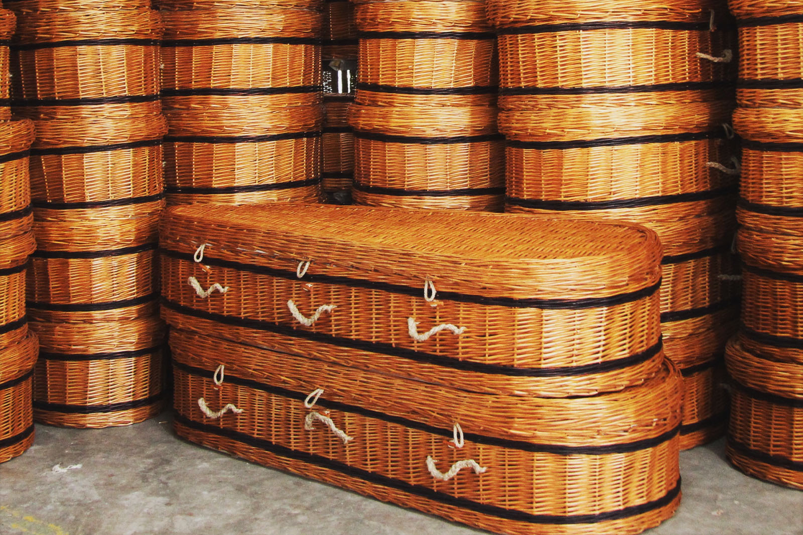 - Each coffin is woven by hand and offered in an elegant oval or traditional shape.
